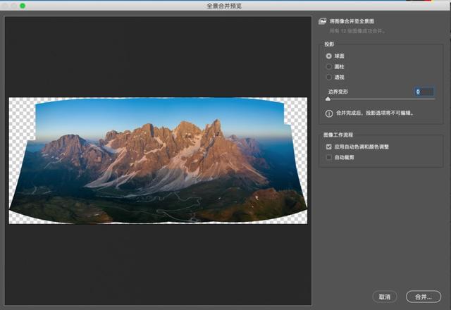 我们采用的是上中下三层接片,投影中的“球面”效果会更合适。我们不要让软件”自动裁剪“,这样会丧失很多像素。选择拉动“边界变形”的滑块,可以看到系统自动把空白的地方填满了,保持了像素不丢失。
