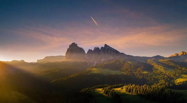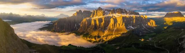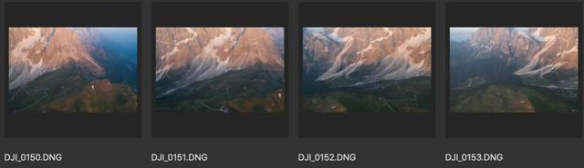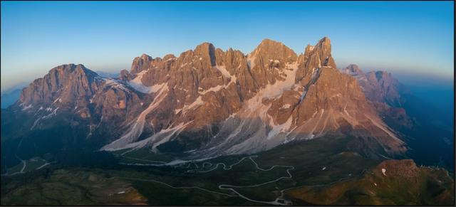 无人机有自动接片的功能,也可以保存RAW格式,但我更倾向于使用手动接RAW格式接片,更加灵活可控。我来通过意大利多洛米蒂山区的一个案例来说明:我的眼前是一座壮观的山峰,用单张照片不足以变现它的气势。等待傍晚时分,落日的光线把山峰照亮,光影层次丰富的时候,我把无人机升空到350米左右,在这个视角拍摄了12张图片。