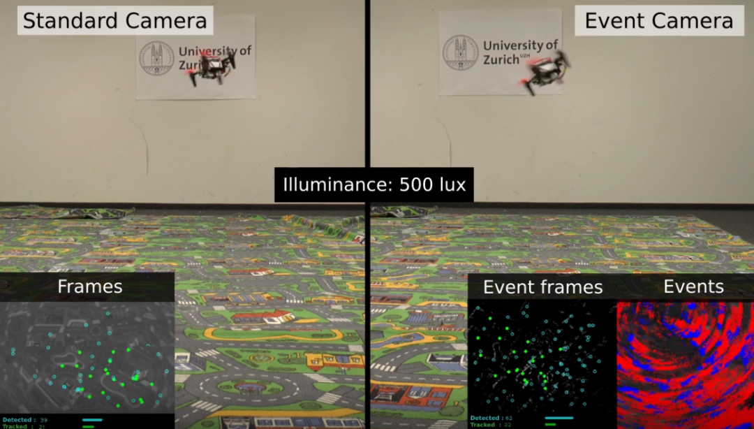 现在说说让无人机飞行的方法,团队为无人机配备了一个RGB摄像头和一个事件摄像头。标准的RGB相机可以检测整个画面的运动,事件摄像头则检测像素层面的变化,可以从中发现微小的变化。