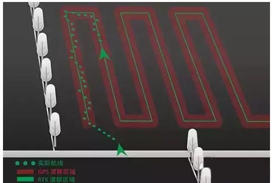 而使用RTK技术时,航线将是一个0-10厘米宽度的区域,与GPS相比,RTK基本等于是直线飞行,弯曲的幅度很小,因此效果将更均匀可控。