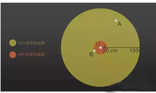 普通GPS的圆概率误差(CEP)有50%左右的概率在2.5米以内,另外50%的误差可能更大,甚至接近10米。上图中,当我们想要寻找O点的位置时,普通的GPS会告诉我们O点在A处,而A则是黄圈直径10米范围内的任意一个点。RTK通过实时差分技术,可以将范围缩小到10cm内。