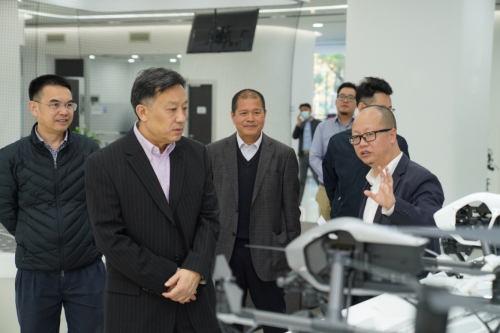 民航局航空器适航审定司徐超群司长、民航局适航司适航审定处刘晓杰处长、民航中南地区管理局陈维副局长、中南管理局适航维修处林和勇处长、民航深圳监管局王育松副局长一行参观大疆创新无人机展厅