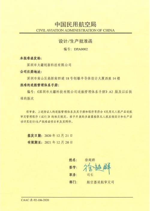 2020年12月21日,民航局适航司在深圳市向大疆创新科技有限公司颁发国内首个植保无人机系统设计生产批准函。