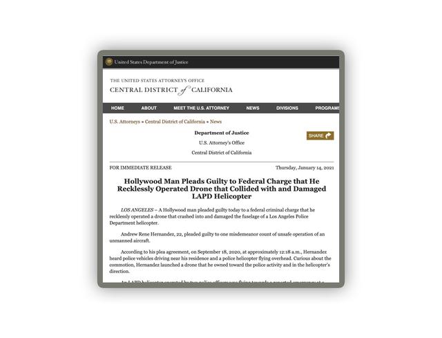 今月14日,22岁被告Hernandez对一项不安全操作无人机的轻罪指控表示认罪。加州警方在一份新闻稿中表示,如果无人机撞到直升机的主旋翼而不是机身,那可能会使直升机坠机。