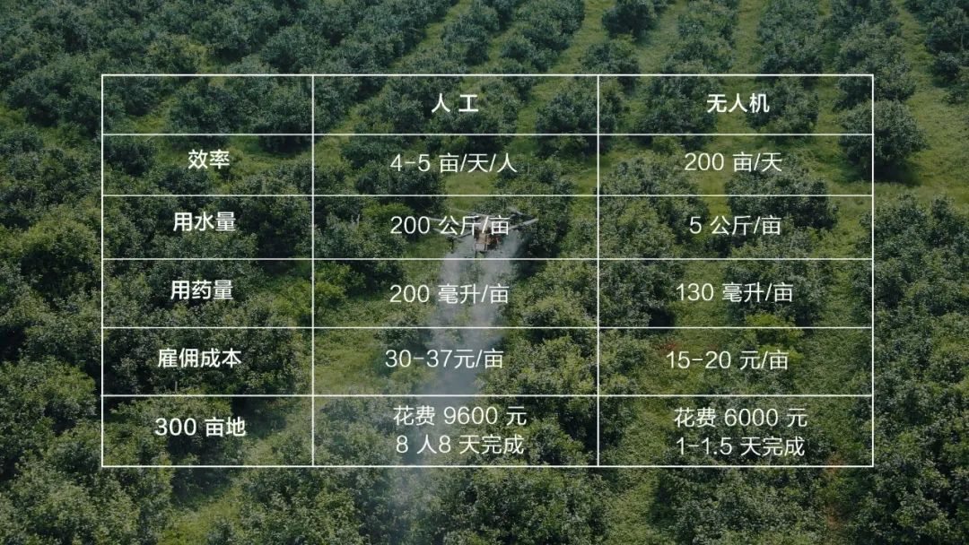 通常植保机作业会按照人工作业亩用量的 60%-70% 来配药,使用大疆 T20 全程飞防减药量达 30% 以上。此外,人工作业一亩地用水量为 400 斤左右,而无人机只需 10 斤水,人工的 1/40 用水量就能达到出色的防治效果。