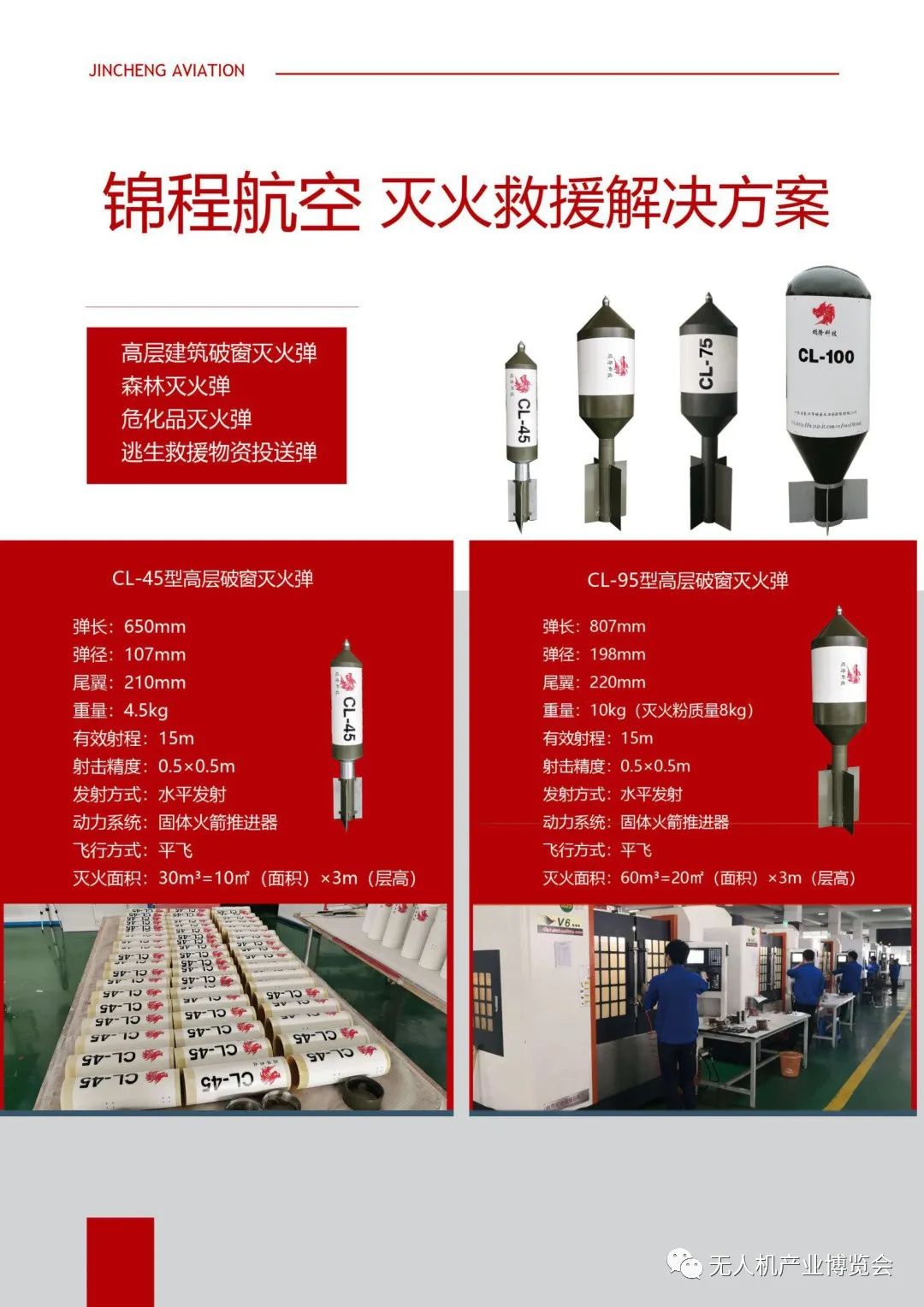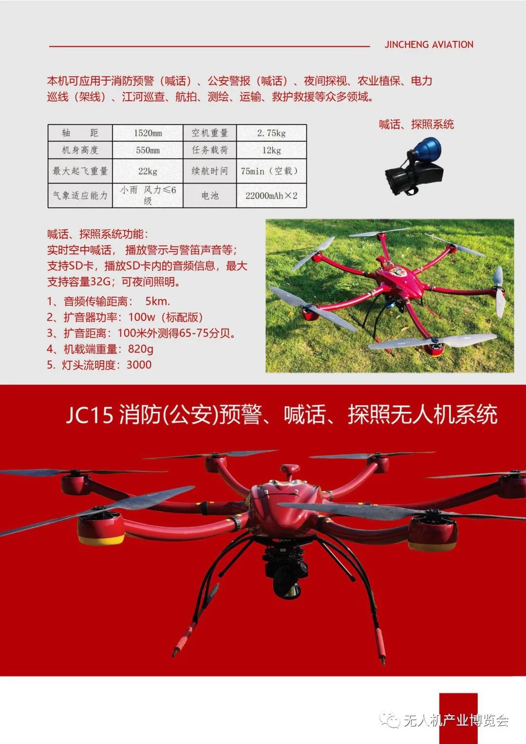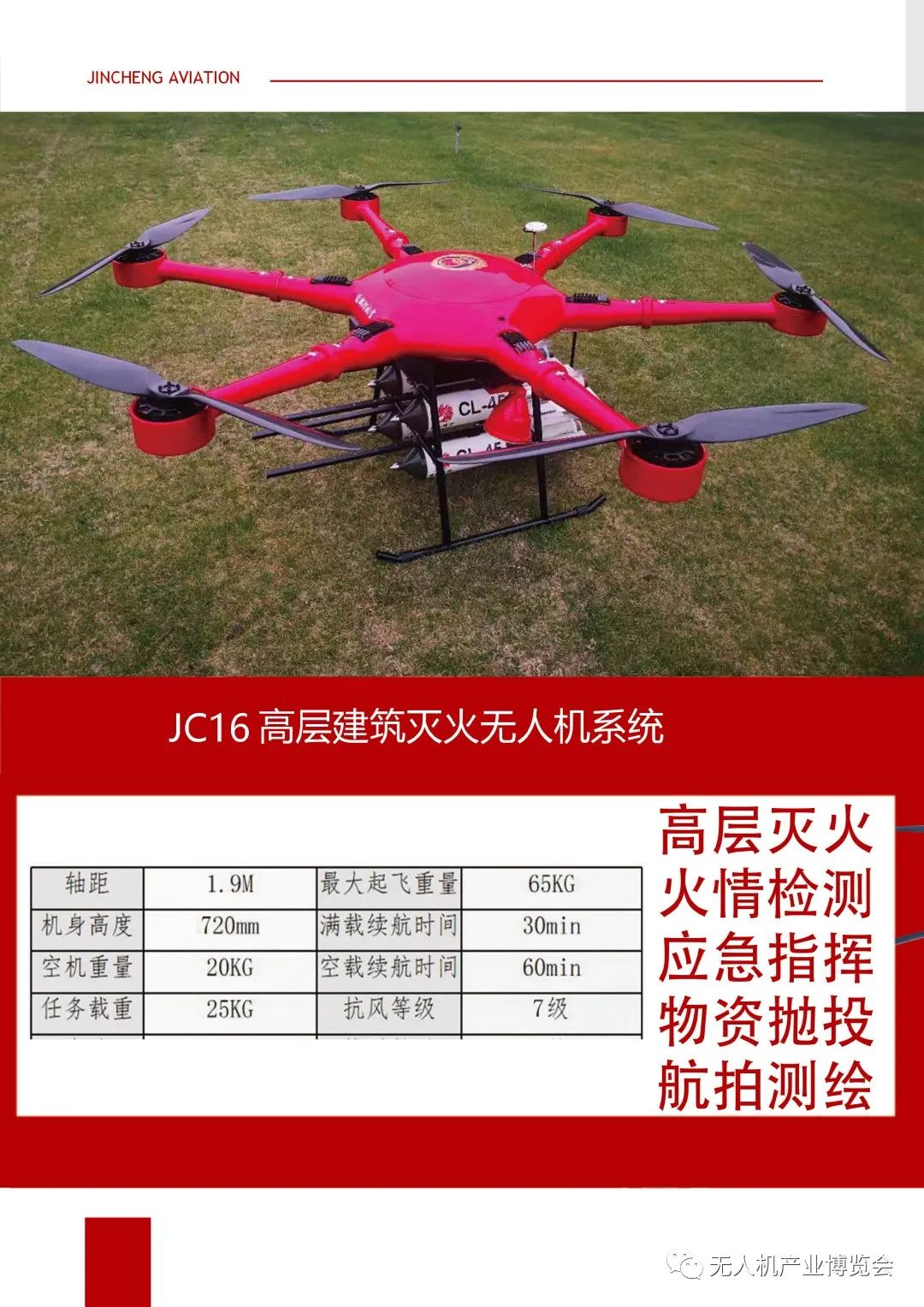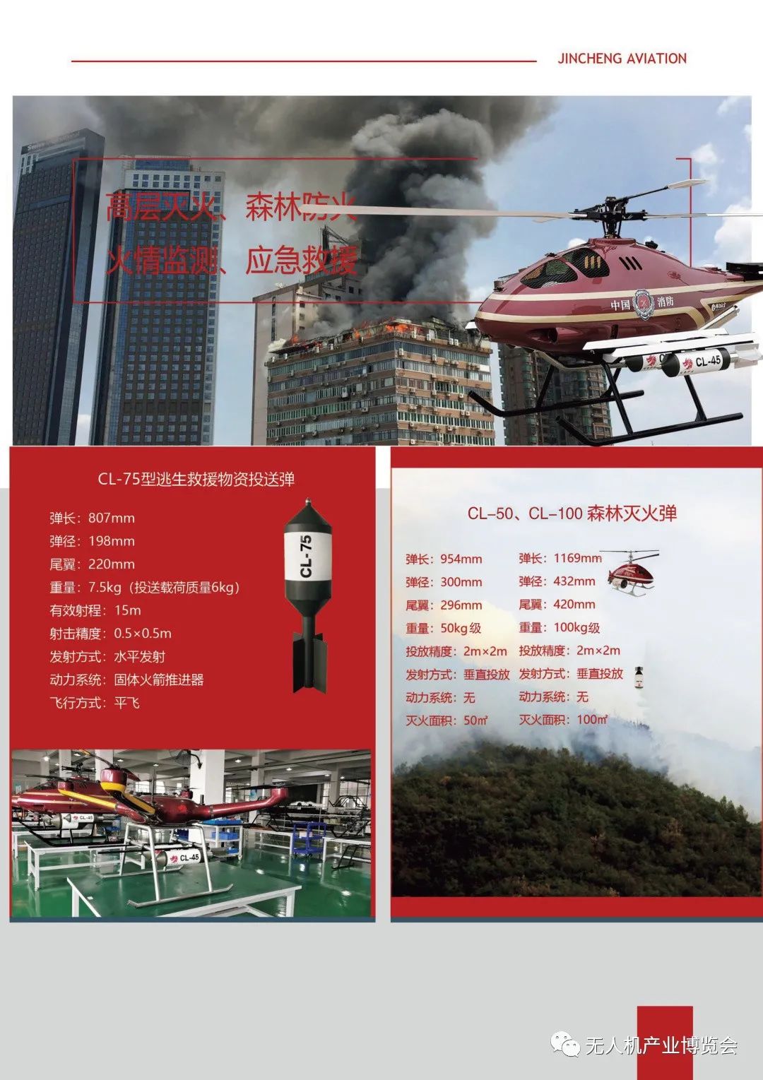 公司在大力引进无人机领域高端技术人才的同时,积极与高校、科研院所等建立了紧密型战略合作关系,目前已在无人飞行器系统设计、气动动力与结构设计、控制与导航系统设计、信息处理与情报分析,以及综合集成等领域都具备了较为先进的专业能力。现已成功研发出多款具备自主知识产权的无人器产品,拥有五大系列二十余型号的无人机系列产品,均处于行业领先水平。公司自主研发的JC950H共轴无人直升机系统,最大起飞重量1000KG,有效载荷500KG,在国内无人直升机系统产品中处于领先水平,填补了国内大载荷无人机系统空白。空神-80中远程无人机系统,满载续航时间12小时以上,可根据任务需求配置不同任务载荷,实现高空侦察、目标打击目标跟踪、边防巡检等需求。今年公司主推产品森林灭火无人机系统和森林灭火弹及高层灭火弹系列产品。森林应急无人机系统可森林巡检、应急救援、森林灭火等任务需求,森林灭火无人机系统有效解决了全球无人机森林灭火的难题。目前公司正在研发一款3500KG 级无人直升机系统,研发成功后将填补全球超大载荷无人直升机的空白。