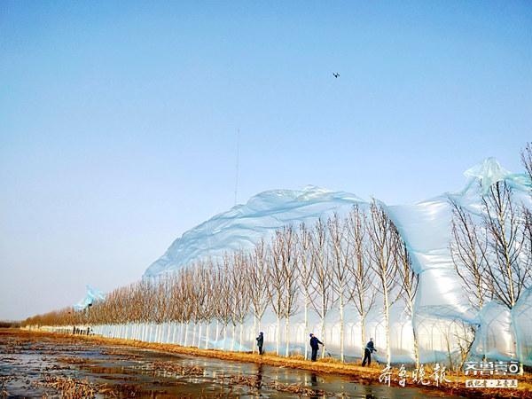 接到报告,国网济宁供电公司特巡人员迅速赶到现场,确认是一块长约150米、宽约20米塑料布被大风刮起,在大风的作用下整块塑料布挂在一排法桐树上,正向着线路方向随风摆动,且线路下方有大片水莲藕池,由于塑料布耐磨,长度较长,靠人力无法收回,对线路安全形成重大威胁。情况紧急,特巡人员第一时间将相关情况上报。