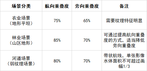 MS600 Pro相对于大疆标准光学负载而言像素少、影像多,需要更高的重叠度要求才可保证数据准确性,对于不同场景我们推荐以下重叠度指标: