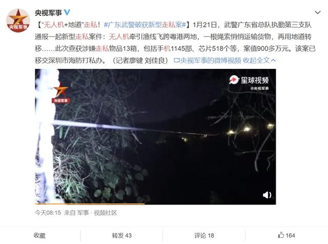 IT之家1月22日消息 据微博 @央视军事 报道,武警广东省总队执勤第三支队于 1 月 21 日通报了一起无人机走私案件。走私者利用无人机牵引鱼线跨域香港和广东省边界,然后牵引绳索搭建走私通道。视频中可以看出,走私物品绝大多数为苹果 iPhone 12 手机。