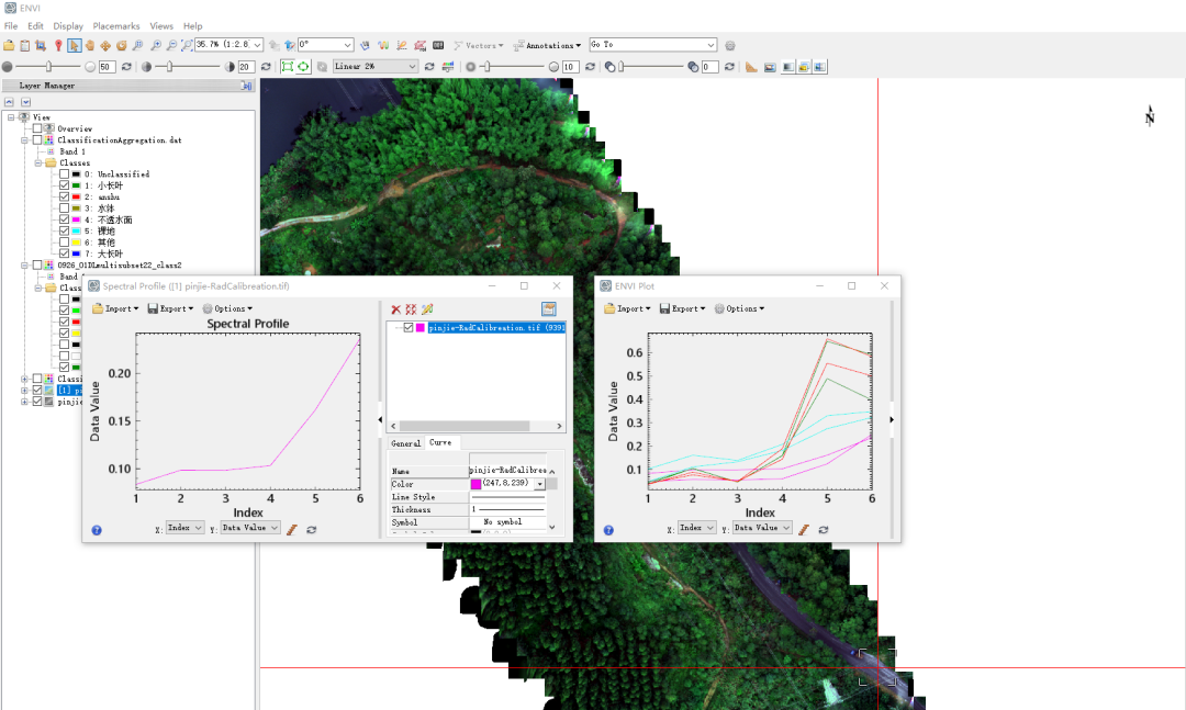 树种分类需要详细分析影像中不同地物的光谱特性,使用ENVI软件针对不同种地物提取光谱特征(如图4所示),并基于特征进行样本分析与模型建立。