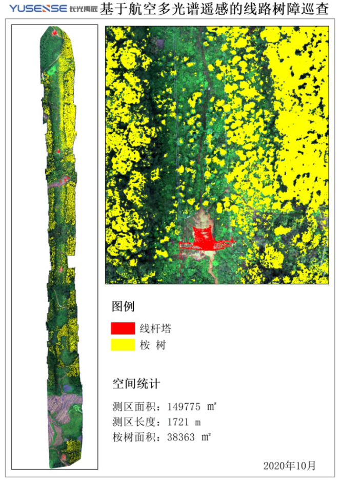 从图4所示为本次项目1号线路段,测区线路长度1.56km,主要对桉树进行了提取,其中红色为线塔,黄色为桉树。从图中可以看出,高大桉树基本分布在线路两侧,面积约3497㎡,线路防护区内桉树已被清除。
