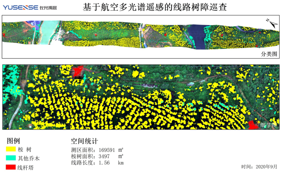 从图4所示为本次项目1号线路段,测区线路长度1.56km,主要对桉树进行了提取,其中红色为线塔,黄色为桉树。从图中可以看出,高大桉树基本分布在线路两侧,面积约3497㎡,线路防护区内桉树已被清除。