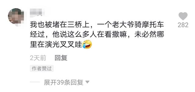 有网友说:我也被堵在三桥上,一个老大爷骑摩托车经过,他说这么多人在看撒嘛,未必然哪里在演光叉叉哇。