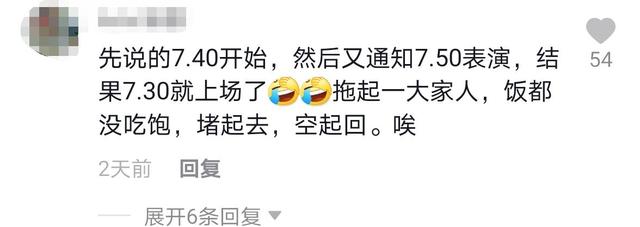 有网友表示:先说的7.40开始,然后又通知7.50表演,结果7.30就上场了。拖起一大家人,饭都没吃饱,堵起去,空起回。唉!
