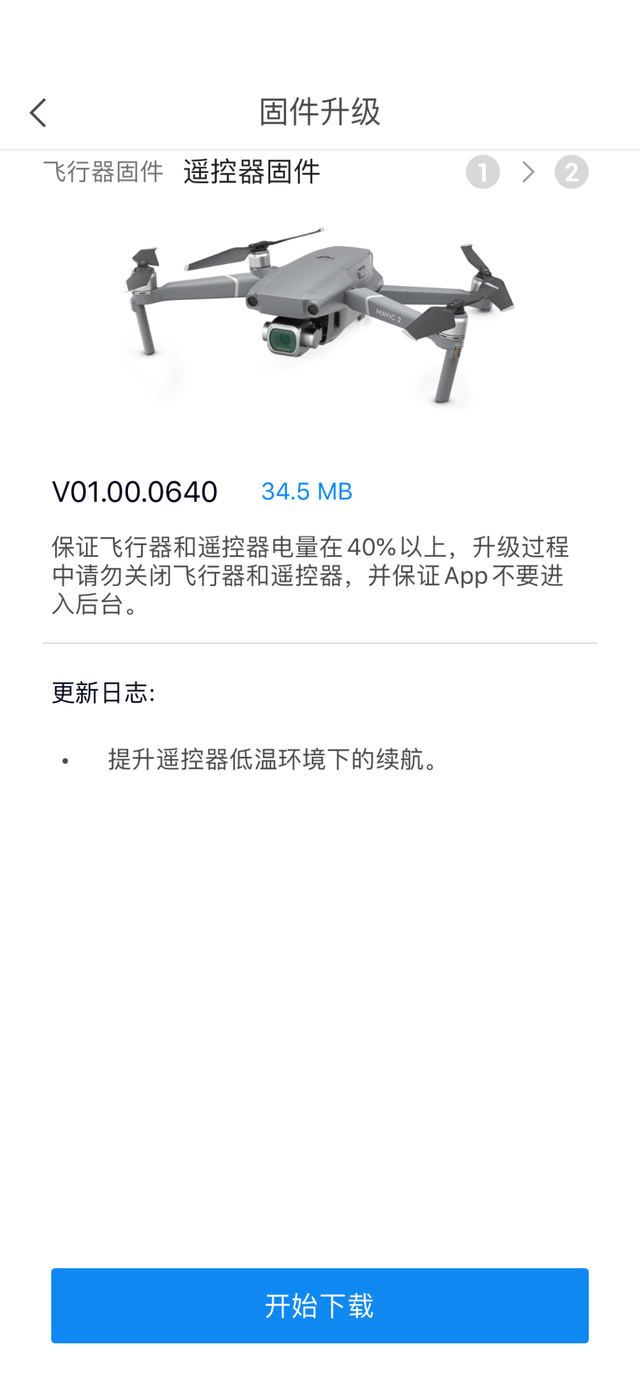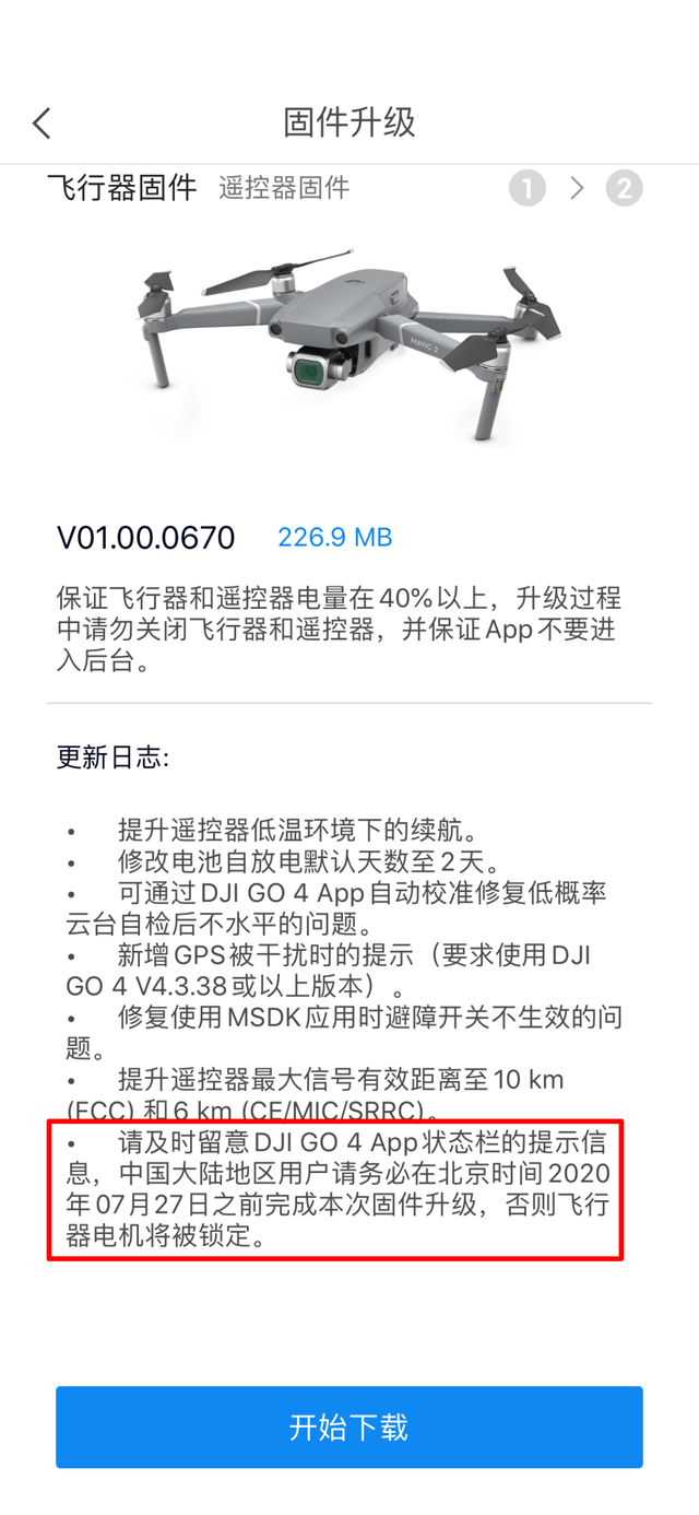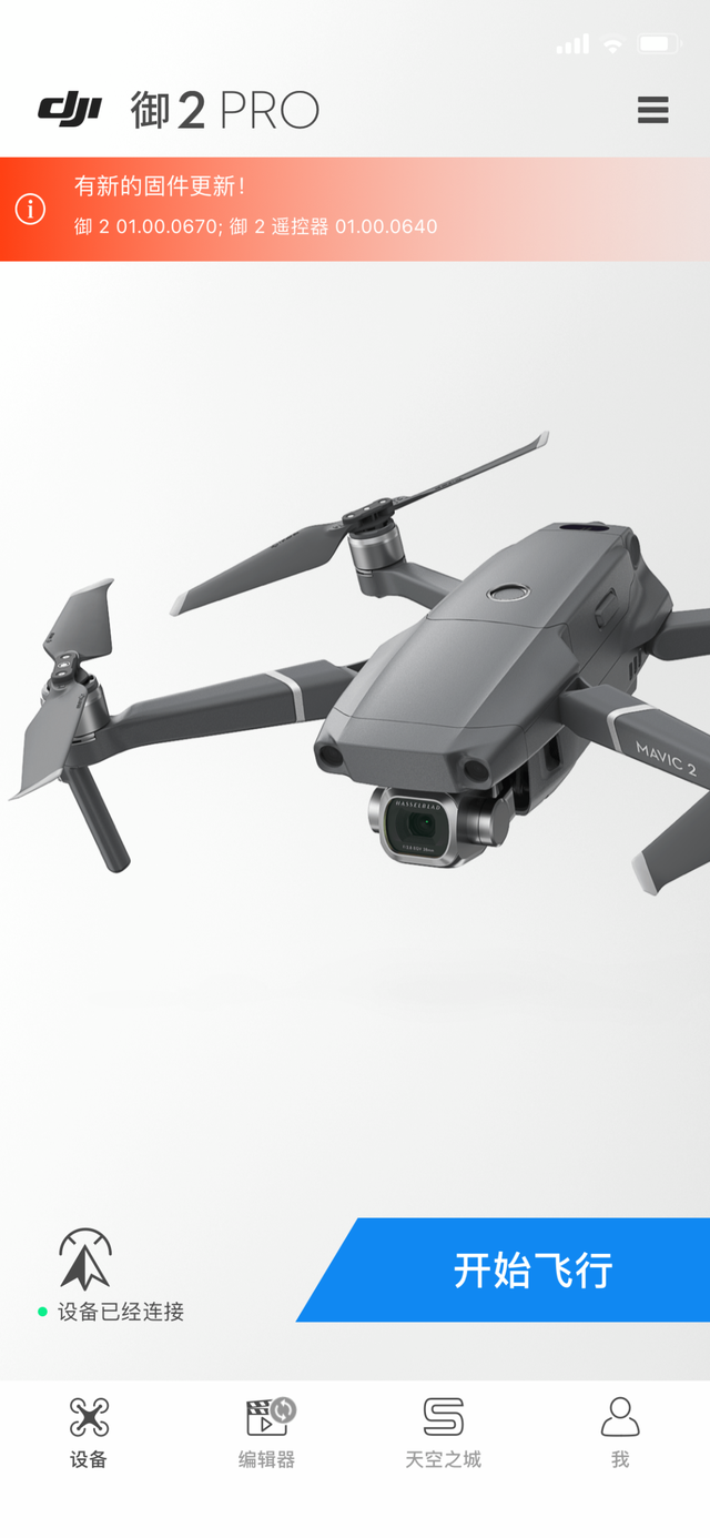 当你打开无人机和遥控器,在网络畅通的情况下,APP会有提升。比如本次的推送如下,在无人机的APP上用红色的标示通知,有固件升级: