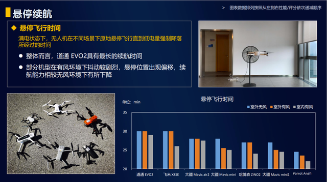 因此,中国移动对无人机满电状态下,在室外无风、室外有风、室内有风三个场景中原地悬停飞行直到低电量强制降落所经过的时间进行了测试,整体而言,道通 EVO2 的时间最长,能达到接近 30 分钟,续航时间最长,但是部分机型在有风环境下抖动较剧烈,悬停位置出现偏移,稳定性较差。
