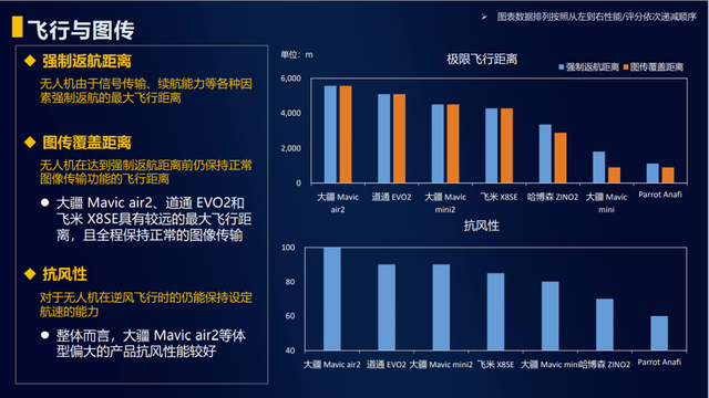 中国移动测试了七款无人机的强制返航距离和抗风性,测试发现当出现信号传输、续航能力等各种原因需要轻质返航时,大疆 Mavic air2 可以坚持的距离最远,达到近 6000 米,道通 EVO2 和大疆 Mavic mini2 在 4000-5000 米之间,这三款的最大飞行距离较远,全程也可以保持正常的图像传输。