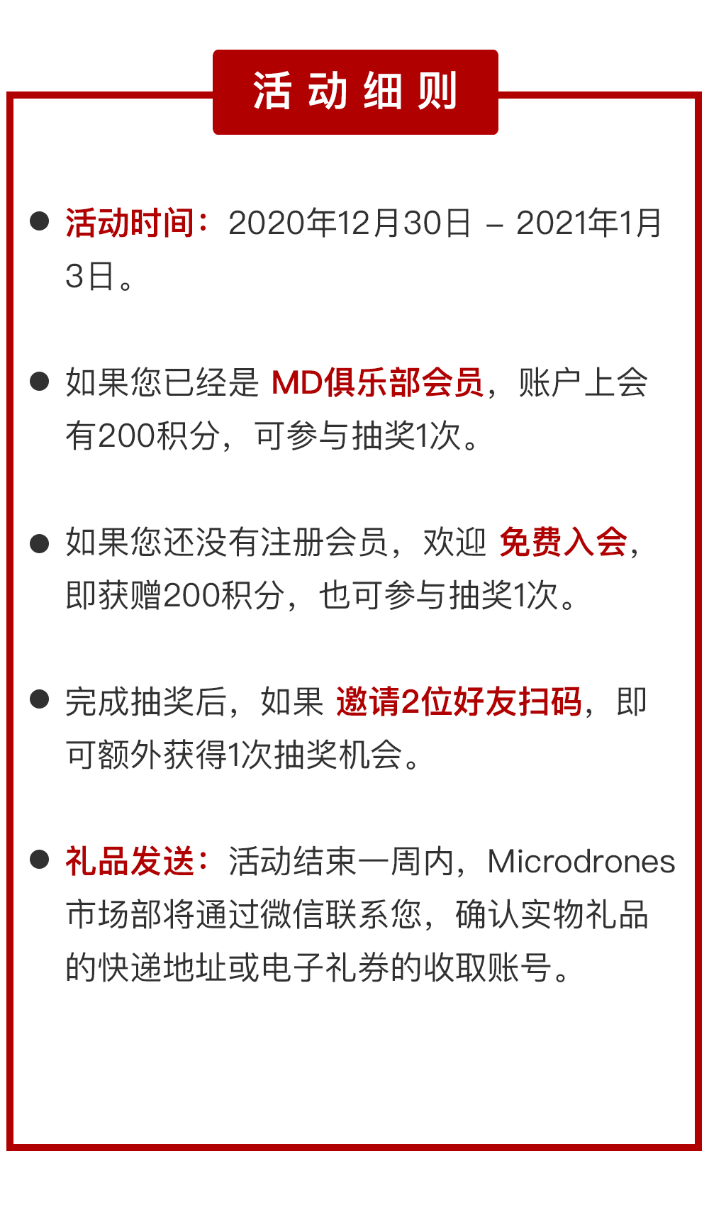 上下欲同者胜,风雨共舟者兴。感谢有您,我们一路前行,收获良多。12月30日,Microdrones推出「2021新年幸运大抽奖」活动,凡MD俱乐部会员即可参加一次抽奖活动,赢取丰富礼品,中奖率超高哦!