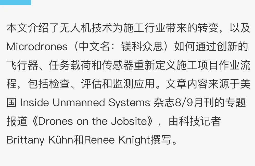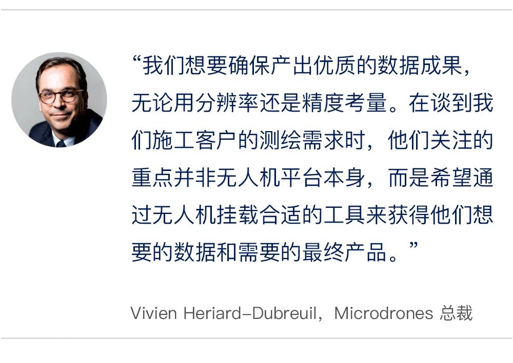 2020 年 5 月,公司决定推出 Microdrones 即服务 (mdaaS)计划,旨在吸引更多客户使用其解决方案。具有竞争力的价格和便捷的定制选项让客户能根据自己的需求选择规划。对Microdrones 的首席运营官 Frank Darmayan 来说,不断发展的业务模式、在创新方面的投资,以及实现更简化的工作流程和更丰富层次的数据,构成了未来的发展方向。“我坚信我们仅仅只是触及皮毛而已,”Darmayan 说,“尽管我们知道当前的硬件已经很好了,但与一年、两年、三年后将要出现的硬件相比,还差得远。我们致力于不断收集更多有价值的信息,协助我们的客户做出越来越好的决策。”