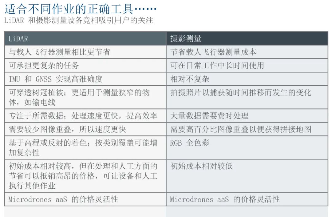 计算成本使用无人机方案进行测量和监测时,LiDAR和摄影测量一样相对于直升机都有明显的成本优势。“试想一下,当您将 LiDAR 安装到直升机上时,一个小时可能需花费三到四千欧元,”Legrand说道,“但如果您使用我们的LiDAR系统,它们可以兼容成本低得多的解决方案。”摄影测量的低购买价格使其非常适合初级和小型公司。“它非常易于取得,这也是为什么现在有这么多测量公司和工程公司都选择使用摄影测量。LiDAR的价格要高得多,因此很多人都不想投资LiDAR,因为他们不确定是否有足够项目赚回成本。”但随着科技进步,包括来自其他行业的发展,使该技术的定价模型变得更灵活。“市场上出现越来越多的LiDAR传感器,它们与相机相比更具竞争力。” Darmayan 也同意这种看法。“相较于传统的测量方法和成本,使用 mdLiDAR1000 进行地形测量现在已日渐实惠且越来越高效。这是因为无人驾驶汽车行业和自主驾驶对这些传感器的需求越来越大。由于这些传感器都是大批量生产的,因而成本降低,价格越来越实惠。我们集成这些传感器,使得预处理准确度达到大约10厘米,然后再通过我们的软件加以改进。”对于拥有经常性业务且现金流较充足的公司而言,LiDAR的数据处理速度更快,使设备和人员有更多时间开展其他工作,从而抵销初始成本。“您需要看一下总成本。以一家聚合材料公司为例,他们一直使用摄影测量来进行平铺测量。这样做的效率低下。他们取得大量数据,然后花四到八个小时重建地形,但他们只需要堆料的数据…… 他们想要了解的不过是体积数据。如果使用LiDAR,没有重叠,亦无需重建。您只需处理采集到的少量数据,便可得到体积数据,完成任务。”