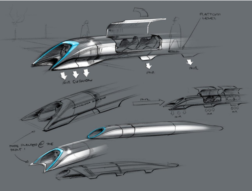 Mardall在Model Y上的工作并不是他唯一的功绩。在特斯拉的十年间,他带领多达60多人的工程师团队,帮助特斯拉早期车型(如Model X和Model 3)开发热能/空调系统,并领导了马斯克的未来派Hyperloop列车的概念开发(如下图所示),并由此产生了Hyperloop-Alpha白皮书。