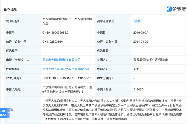 企查查APP显示,近日,深圳市大疆创新科技有限公司公开多项涉农业科技专利。其中,仅2021年1月份以来,就公开了包括“一种农业植保无人机”“喷洒无人机的作业规划方法、系统和设备”“水泵流量的控制方法、水泵控制系统和农业无人飞行器”“无人机的喷洒控制方法、无人机和存储介质”等在内的多项涉农专利。其中“无人机的喷洒控制方法、无人机和存储介质”专利,摘要显示, 该专利系一种无人机的喷洒控制方法、无人机和存储介质;方法包括:获取与目标作物相对应的喷洒作业点,喷洒作业点与无人机相对(S1);在无人机上的多个喷洒设备中确定至少一个目标喷洒设备(S2)等。该方法实现了在无人机执行喷洒作业时,通过目标喷洒设备对目标作物进行喷洒操作,不仅保证了喷洒作业的质量和效率,并且避免了浪费大量的药物。