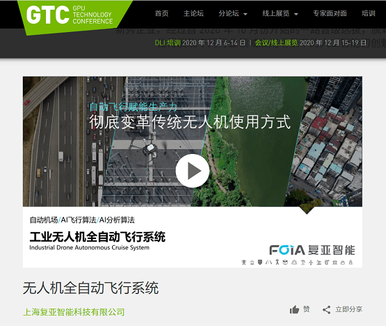 由NVIDIA主办的2020 GTC中国线上大会拉开帷幕,复亚智能凭借行业领先的高性能自动飞行AI算法,脱颖而出列入初创企业最终展示NVIDIA GTC CHINA 2020 INCEPTION SHOWCASE 2020,向全球开发者、行业专家展现无人机AI自动飞行能力。