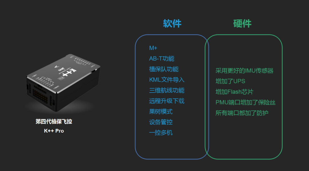 K++Pro是极翼第四代农业飞控,硬件上有更多保护设计,确保农业植保无人机飞行的稳定。在软件上,针对果树,山地等作业场景进行功能开发,并与极测680农业测绘无人机等设备采集三维数据完美融合,全方位提高农业无人机的作业效率,扩大了农业无人机的应用场景。K++Pro还针对无人机整机厂等合作伙伴开发外设管理认证功能,提高整机厂家对外设的管控,提高售后水平的同时,强化了售后盈利点。