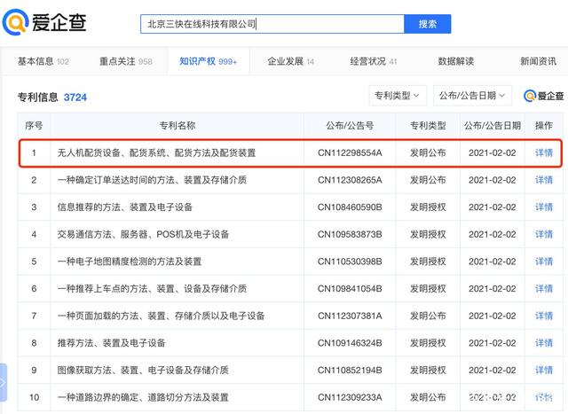 爱企查App显示,北京三快在线科技有限公司公开了一项名为“无人机配货设备、配货系统、配货方法及配货装置”发明专利,公开号CN112298554A,申请日期2020年9月。