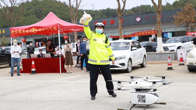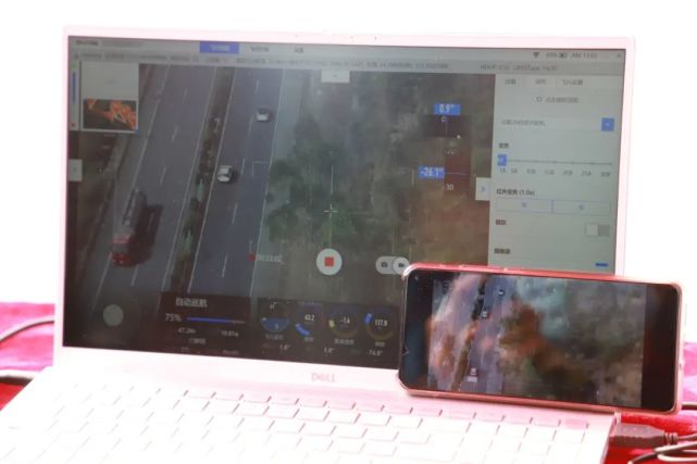 ▲现场,装载有救援物资的无人机驶向预定区域投放。