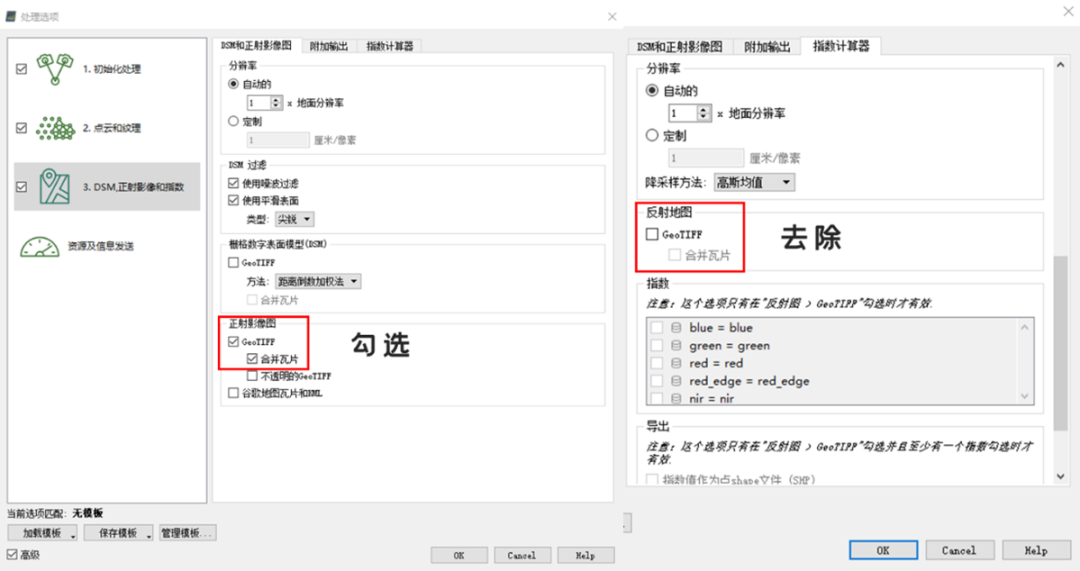 ③需以“正射影像图”的方式输出结果,即在选项中的“3.DSM正射影像和指数”菜单中,将“DSM和正射影像图”下的“正射影像图”勾选,同时将“指数计算器”中的“反射地图”去除。