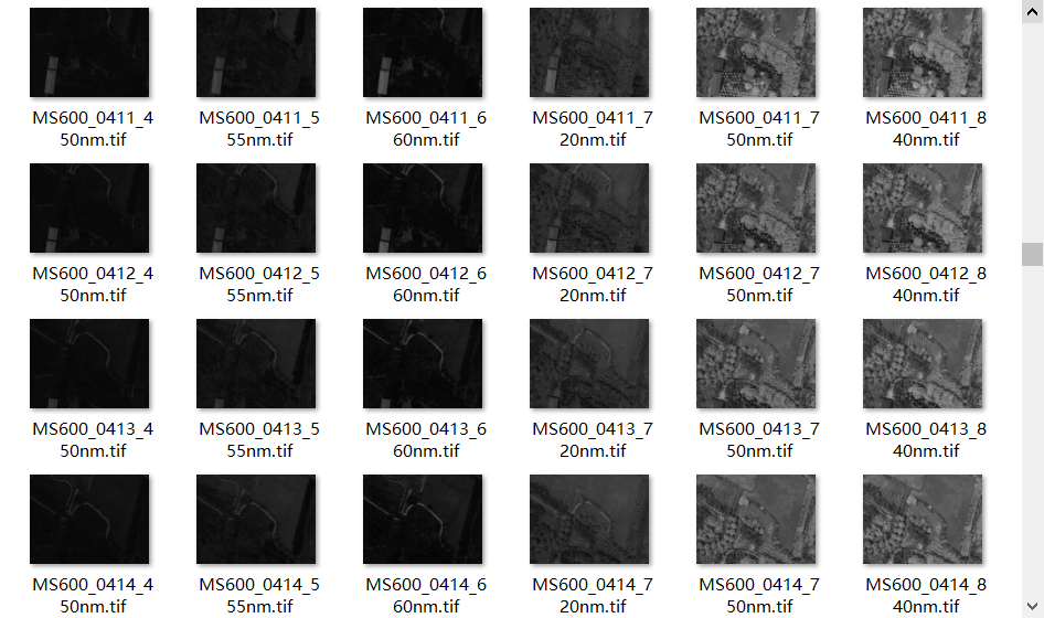 影像在经过Yusense REF软件校正后,可通过查看影像明暗情况评估校正质量。校正前各波段亮度较均匀,校正后波段由低到高表现出由暗到亮的趋势,这是由于进行反射率校正后,短波部分反射率偏低,整体偏暗;长波部分反射率偏高,整体偏亮。
