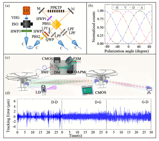 为了解决自由空间光量子通讯常见的光衍射导致的损失,团队设计了一套光的准直系统,在无人机B上重塑接收到光子的波前,使得光子能以更高效率被中继,让地面站更容易光测到。