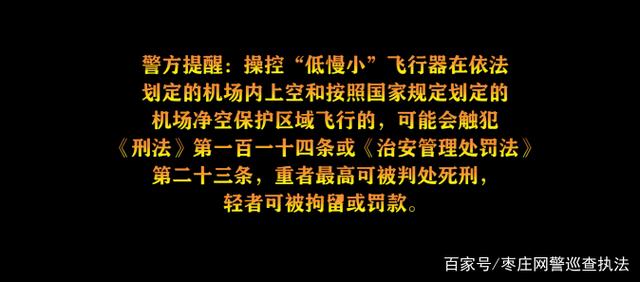 警方提醒:操控“低慢小”飞行器在依法划定的机场内上空和按照国家规定划定的机场净空保护区域飞行的,可能会触犯《刑法》第一百一十四条或《治安管理处罚法》第二十三条,重者最高可被判处死刑,轻者可被拘留或罚款。