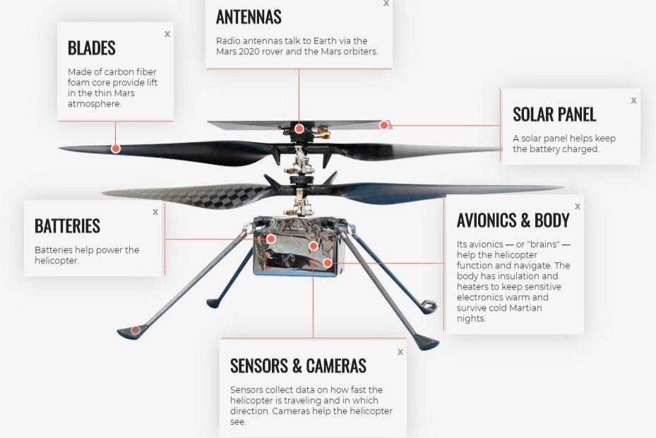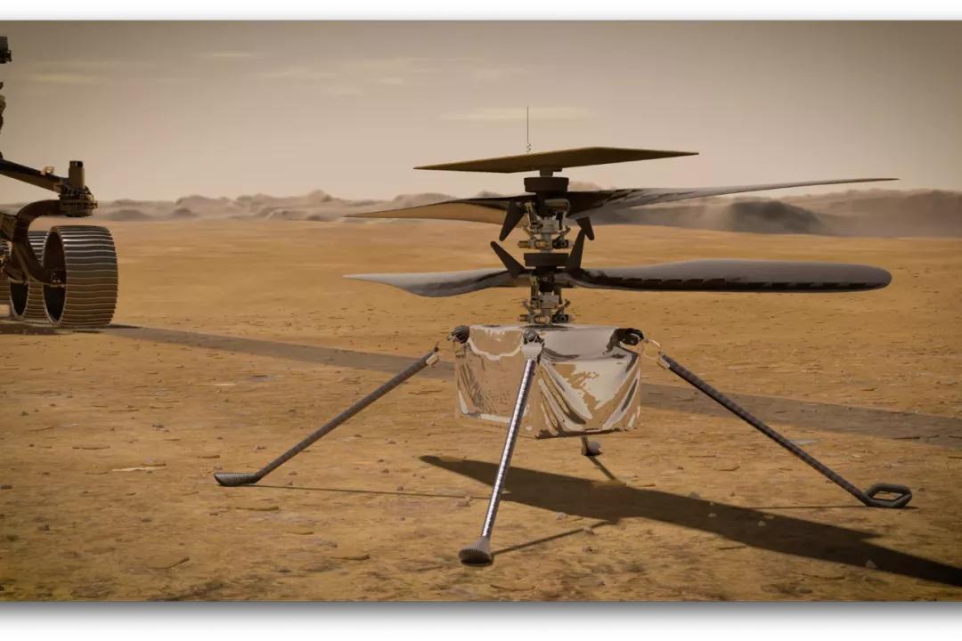 这架无人机由 NASA 喷气推进实验室(JPL)着手设计,重量仅为 1.8 公斤,高 0.5 米,螺旋桨直径 1.2 米,装在探测器的腹部,主要用于拓展火星车的视野。