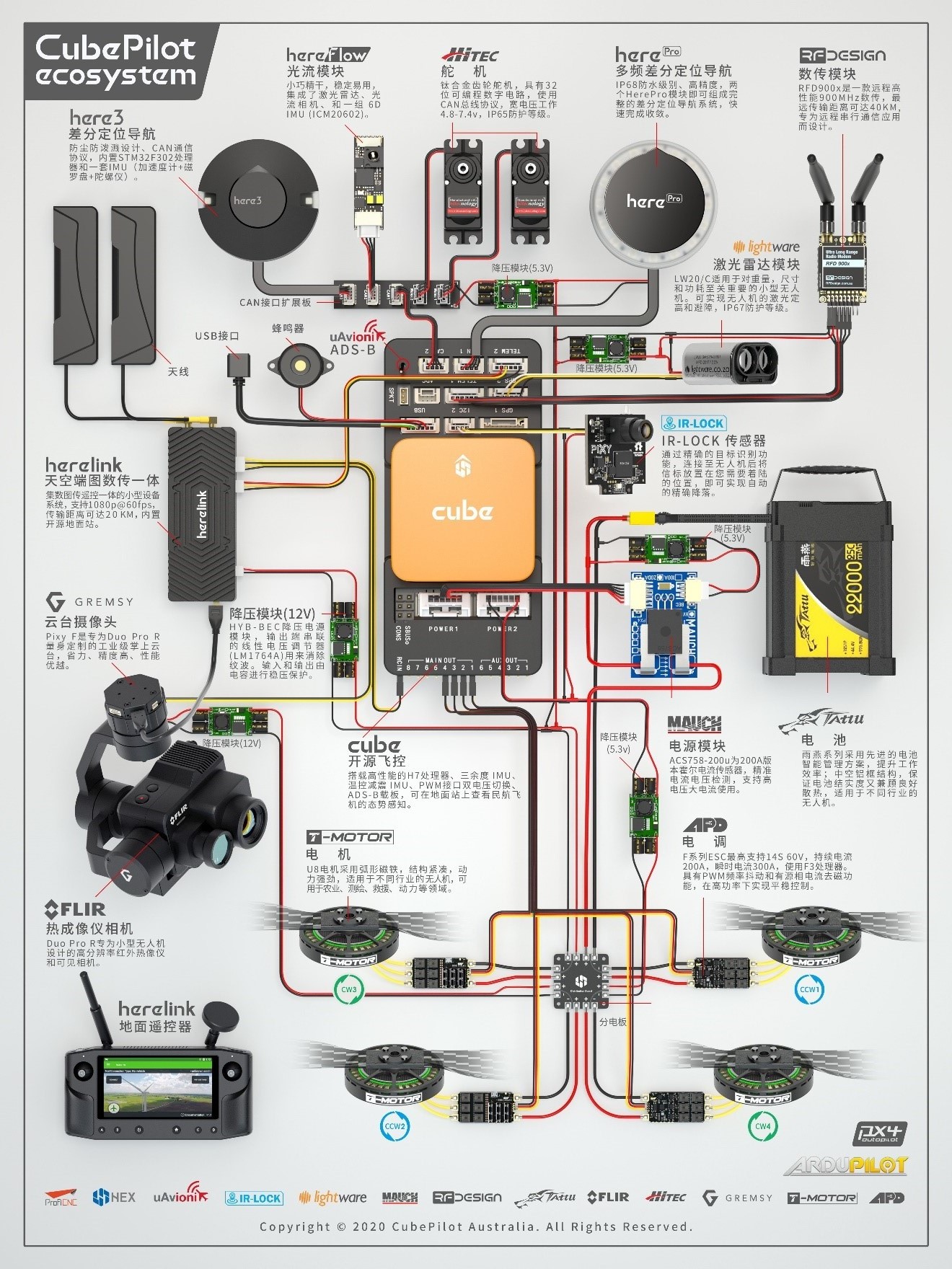cube开源飞控:搭载高性能的STM32H753主处理器和STM32F100协处理器芯片,有着高速数据运算能力,扩展丰富的传感器接口,可以在不同的场景下,连接相应传感器,为飞行提供更多选择和应用。飞控使用开源固件可以支持多种机型,有:无人车、无人船、多旋翼、固定翼、垂直起降固定翼、直升机、潜水艇。支持全自主航线、关键点围绕、鼠标引导、FollowMe、自主调参等高级飞行模式。双冗余电源接口,电源模块5.3V供电。