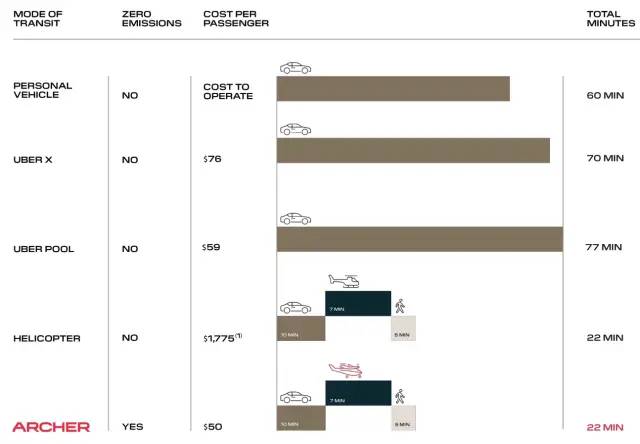 2、大量资金押注evtol将成为城市和城市间交通组合的革命性补充,降低噪音是一个关键原因,但主要原因是成本。空中出租车的支持者认为,电力推进的简单特性将使它们的建造成本显著降低,运营成本也会成倍降低。Archer在其投资者报告中列举了一些非常乐观的数据,以从曼哈顿到肯尼迪机场的高峰时段18.2英里的旅行为例。