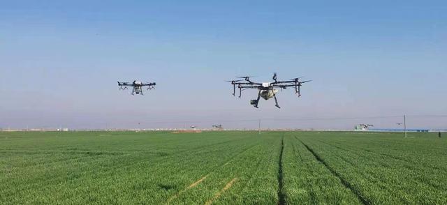 图为该中心组织十余架无人机在太平镇南高庄村小麦高产示范片实施飞防作业