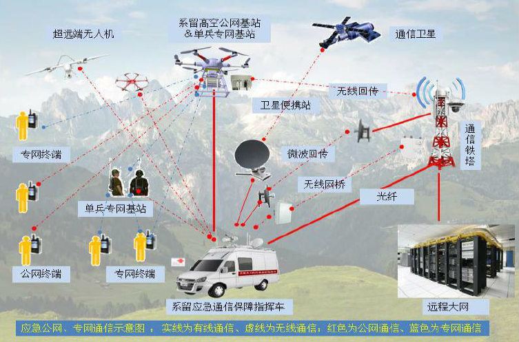 系留无人机具备固定节点悬停、滞空时间长的典型特征,特别适合用于通信中继、覆盖应用。围绕系留无人机系统,配套多台机动能力更强的旋翼无人机、固定翼无人机配合作业,各个固定节点或机动节点形成通信数据链紧密联系、协同工作,搭载2/3/4/5G通信基站、自组网无线通信设备,迅速建立空中自组网通信系统,并与地面单兵通信设备形成一个完美的应急通信自组网,可以广泛适用军事通信侦查指挥和人民防空、国家电网、石油开采、环保监测、气象监测、森林防火、水利防汛、地震救援等应急通信领域。