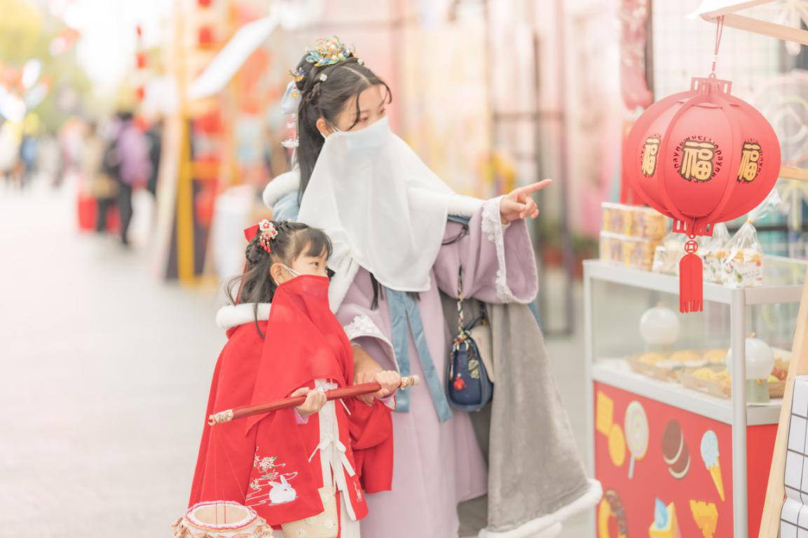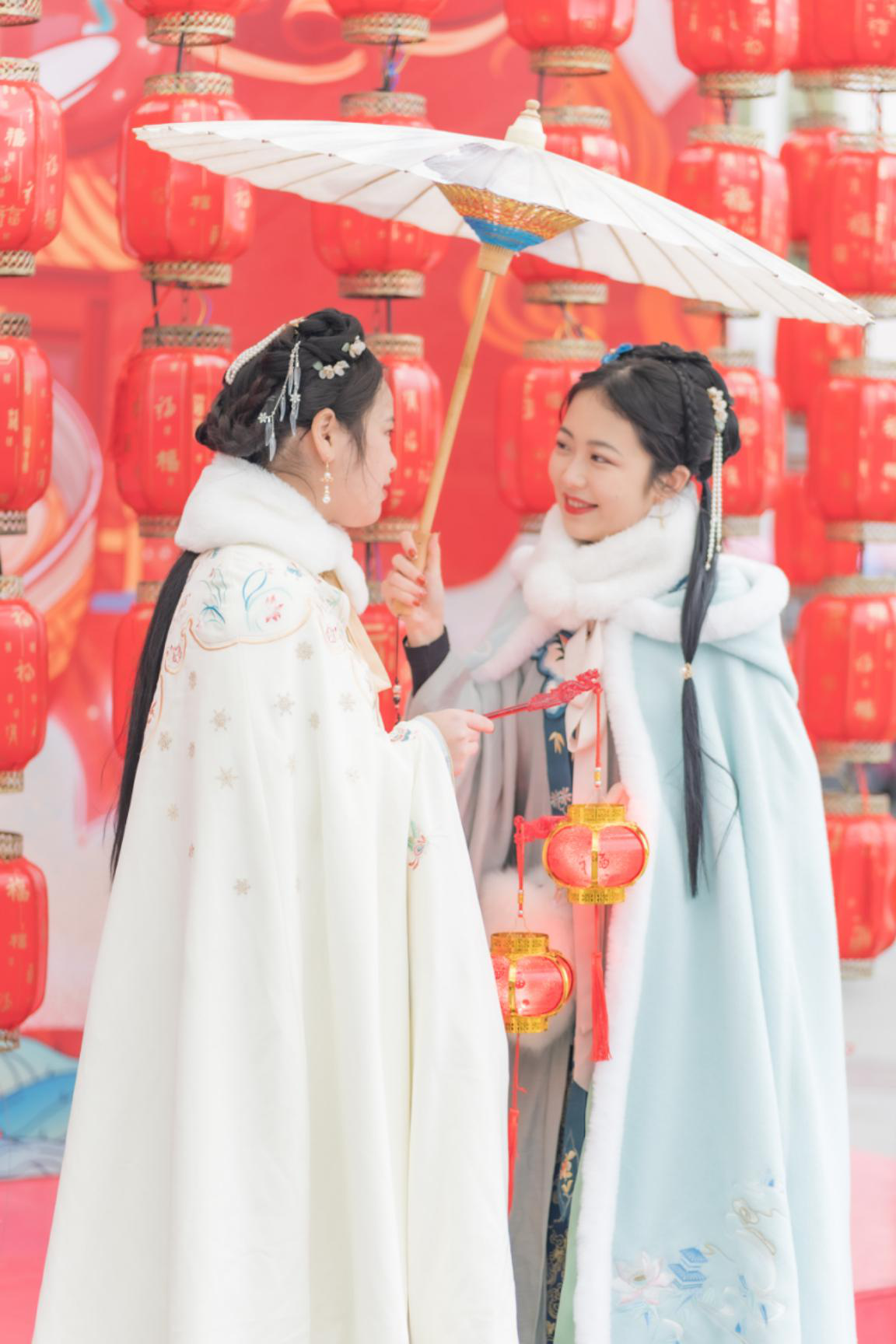 下午六点,古风灯笼打卡点前聚集了不少游客,大家轮流上前拍照留念。记者在现场看到,不少游客身着汉服手提花灯站在灯笼墙前,汉韵十足引人注目。“园区有很多传统元宵节的元素,古色古香的手提灯笼、红红火火的灯谜条、变化多端的非遗糖画,就好像一下去到了古人诗词里所说的场景一样。你看我今天还特意穿了汉服来呢。”李女士指着灯谜墙的方向说道。灯谜墙上悬挂满灯谜条,现场游客热情高涨,争相破迷题。