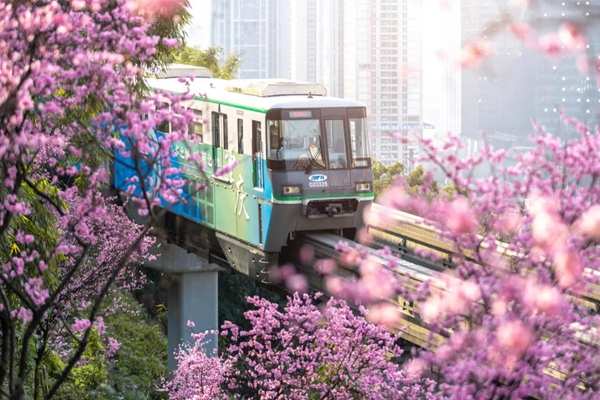 时至二月下旬,春色浸满山城重庆。在渝中区佛图关一带,逶迤连绵的梅花饱含春光,吸引着四面八方的游客前来观赏。除了拍摄美人梅之外,游客们举起手机相机,等待着每几分钟,就会开来一趟的单轨二号线列车。当通体彩色涂装的列车,穿过沿途春花烂漫,被网友称为是“开往春天的列车”。
