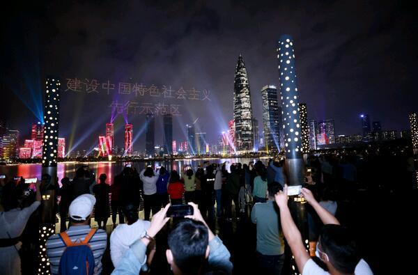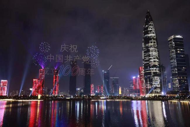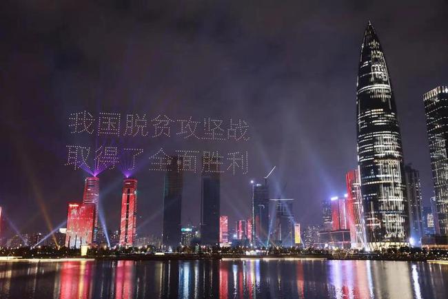在当晚的深圳湾夜空中,无人机编队不断变换队形,依次呈现出“庆祝中国共产党成立100周年”“我国脱贫攻坚战取得了全面胜利”“建设中国特色社会主义先行示范区”等字样。