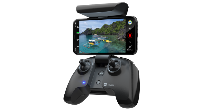 · Skydio控制器:类似游戏手柄,用于控制无人机。它包括一个底座,可以放置智能手机,用于显示从无人机传入的视频。