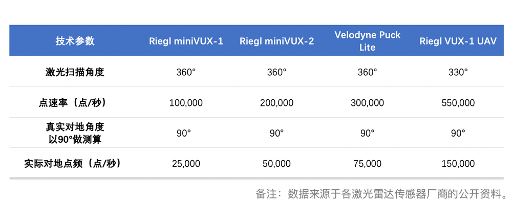 4. 点云密度大在采用不同LiDAR传感器扫描同一区域的测试项目中,mdLiDAR1000HR系统采集的点云密度体现了较大的优势,它来自性能优越的Velodyne Puck Lite 激光雷达传感器。以下为市场上各款激光传感器的技术参数对照(未经无人机系统集成前)。