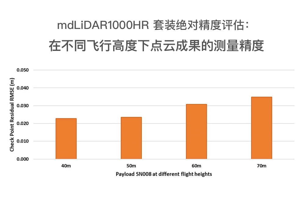 经测试,mdLiDAR1000HR 系统在不同飞行高度生成的点云精度如下表所示,RMSE(均方根误差)均小于 4cm。