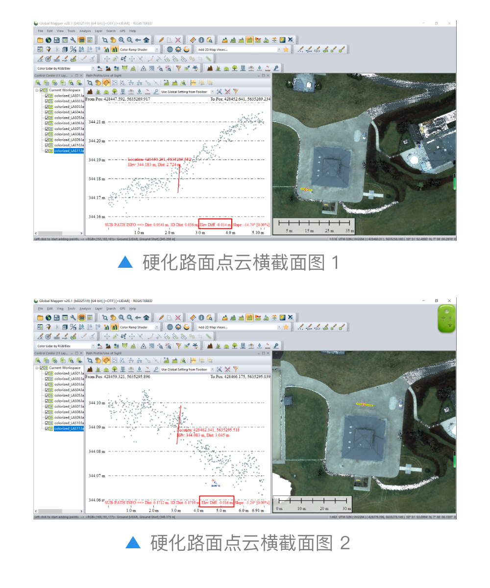在其他测试项目中,我们通过 mdLiDAR1000HR 系统在30至60米之间的飞行,扫描不同反射率的目标表面(沥青、砾石、屋顶、自然地面)来分析其精度。mdLiDAR1000HR 的扫描点和图像的视场角均为90度,当以 8米/秒的速度在 60 米处飞行时,一倍 σ 可达到 2.1 厘米。这一点得到了重复性分析的证实。2. 点云厚度薄。在 Siegen 的实测项目中,mdLiDAR1000HR 系统采集的原始数据经过 mdInfinity 软件点云处理和优化后,平坦表面的后处理点云切片厚度能够实现 2cm 左右。与目前市场上的入门级 LiDAR 的点云厚度均在 20cm 左右相比,mdLiDAR1000HR 系统展现出强大性能。