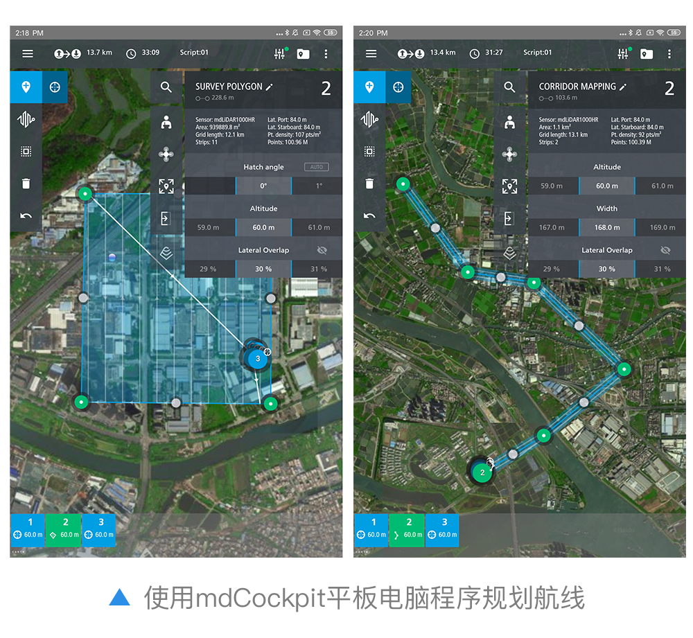 3. 作业效率高除去起飞和降落时间,mdLiDAR1000HR 系统在任务航线内通常可飞行30分钟。如果飞行速度设置为 8m/s,飞行高度 60m,在重叠率为 30%情况下,带状航线覆盖长度约 13km,一般网格测量覆盖面积约 1km²。