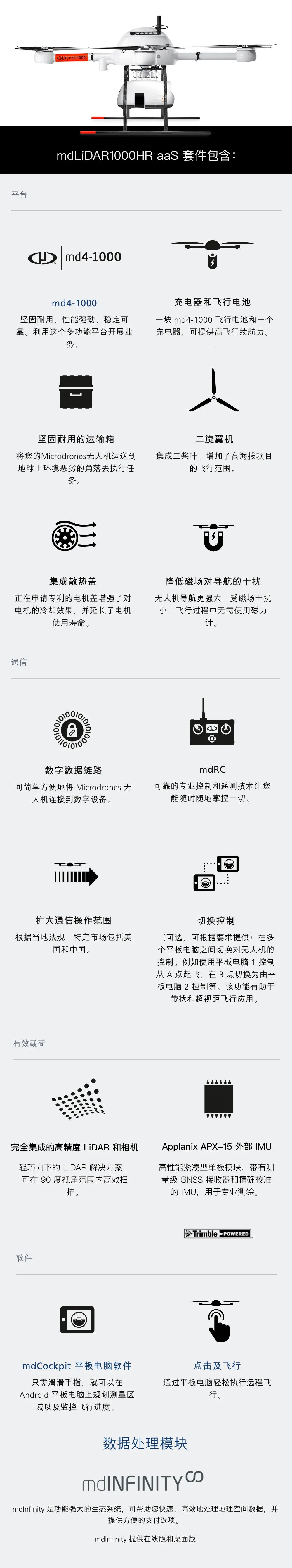 5. Microdrones工作流程简单易用,数据后处理效率更高Microdrones 的高度集成套装让外业操作简单,无人机挂载均采用极简的工业设计。这次推出的 mdLiDAR1000HR 套装与 mdMapper1000DG、mdMapper1000DG 3D 等现有产品套装一样,支持快速更换载荷。内业方面,mdinfinity 软件平台强大的数据处理功能可助您快速解算轨迹、生成点云和增强精度。不仅如此,它还包含航带平差、点云着色等高级功能,供您“一站式”完成内业工作流程。mdInfinity 软件平台的用户界面和操作方式非常简单,用户只需要导入原始数据,软件即可自动运行。客户接受简单培训后即可快速上手,马上提升工作效率。