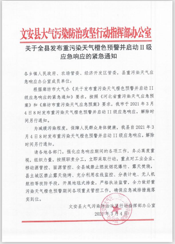根据廊坊市大气办《关于发布重污染天气橙色预警并启动II级应急响应的紧急通知》要求,按照《河北省重污染天气应急预案》和《廊坊市重污染天气应急预案》要求,我市于2021年3月4日8时发布重污染天气橙色预警并启动II级应急响应,解除时间另行通知。