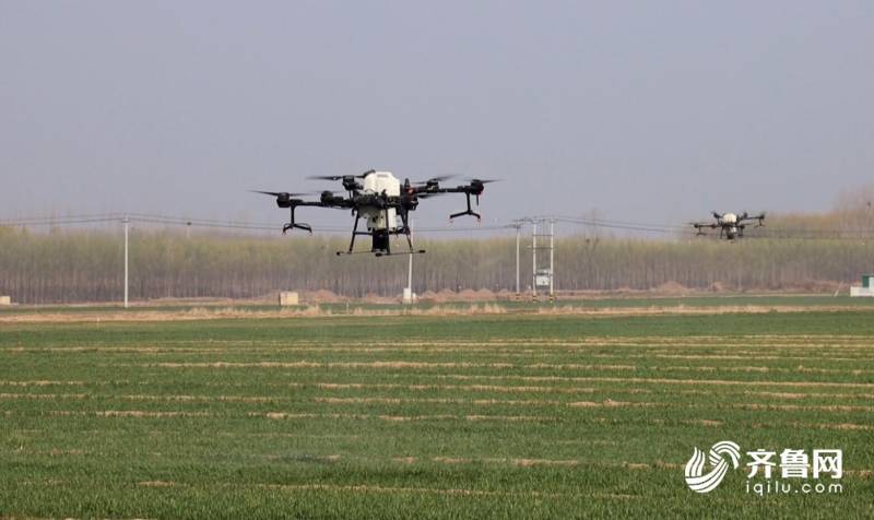 初春的黄河岸畔碧波千里、生机盎然。八台农用植保无人机正在为齐河县胡官屯镇段庄村的麦田进行病虫害统防统治,村里3200多亩麦田全部托管给了专业的农业社会服务组织。